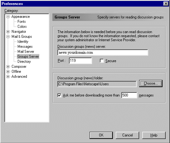 10) If desired, choose a news group folder (the default is O.K.) Your Netscape Communicator/Netscape Messenger is now configured to send and receive email and use newsgroups. For program features and functions, consult the Netscape "Help" files, or contact Netscape Technical Support at: http://help.netscape.com/ |