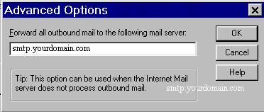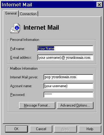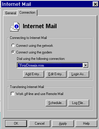 11) Make sure Connect using the modem is selected. Under Dial using the following connection make sure that your dial-up networking connection is selected. If it is not, click on the down arrow on the right-hand side of the box and select your connection. Note: during setup you may have chosen another name (i.e. "My Connection", "YourDomain.com", "home", etc.) for your connection. Just select whatever name is associated with your dialup. 12) Click Apply and OK to save your settings You are now ready to begin sending and receiving email with Microsoft Exchange or Outlook 97. For program features and functions, consult your Outlook "Help" files or contact Microsoft Technical Support online at: http://www.microsoft.com/Support/ |